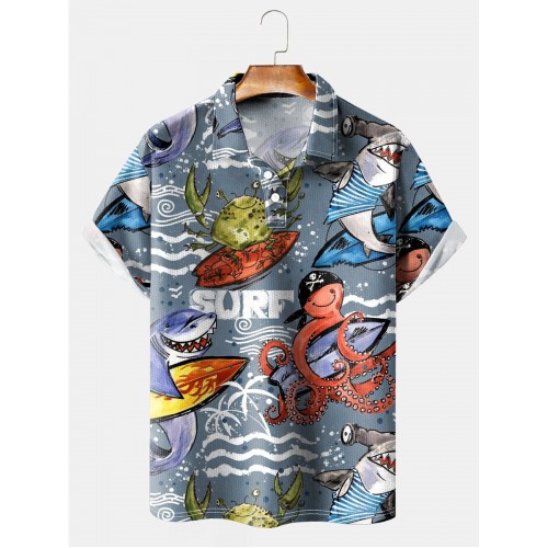Cartoon Sea Fish Shark Octopus Crab Retro Surf Short Sleeve Polo Shirt